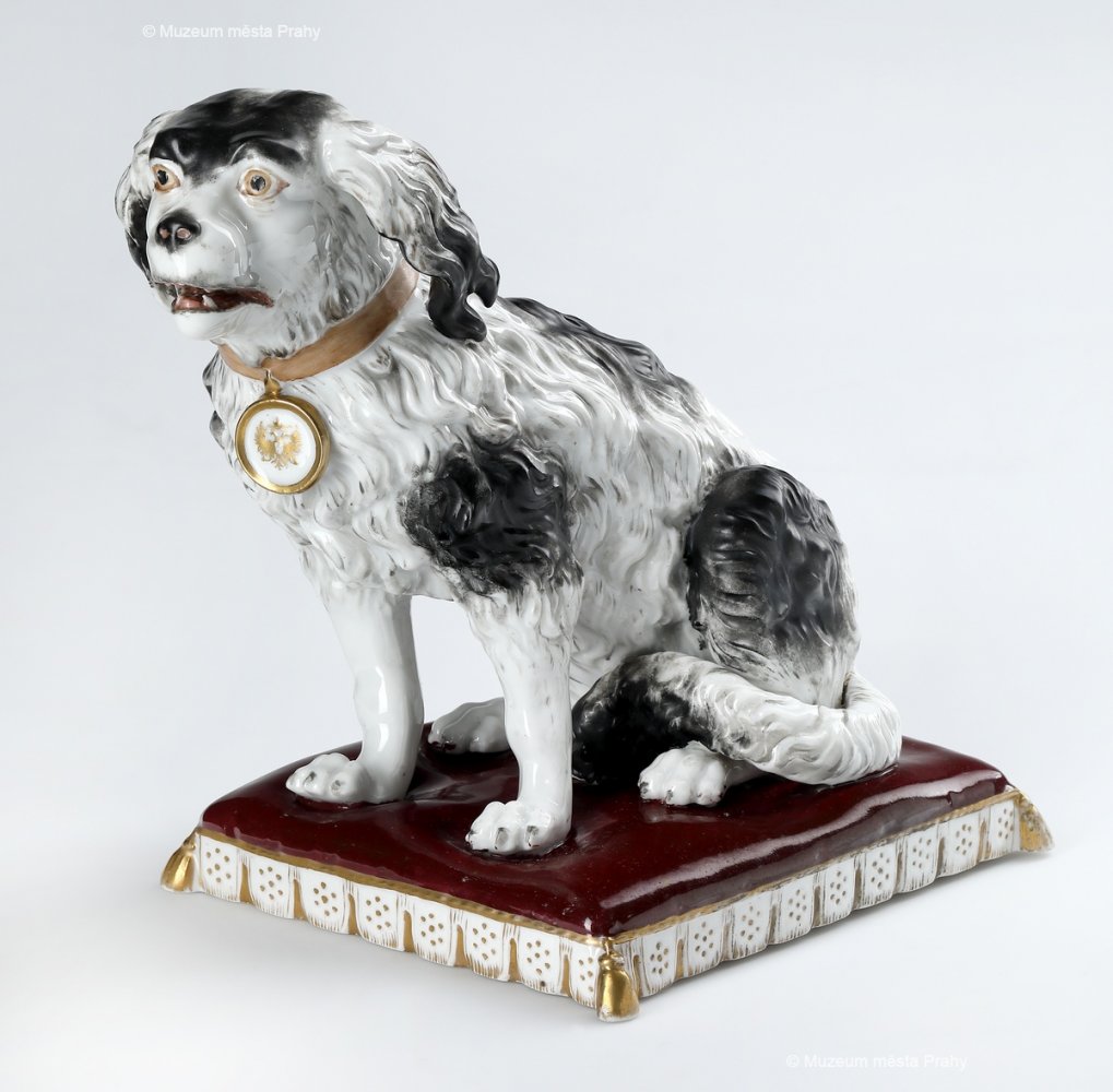 Vykuřovadlo ve tvaru pinče, po 1852, glazovaný, malovaný, zlacený porcelán, v. 21 cm, vyrobeno ve smíchovské porcelánce, značka výrobce Prag, sbírka MMP, inv. číslo H 027 103