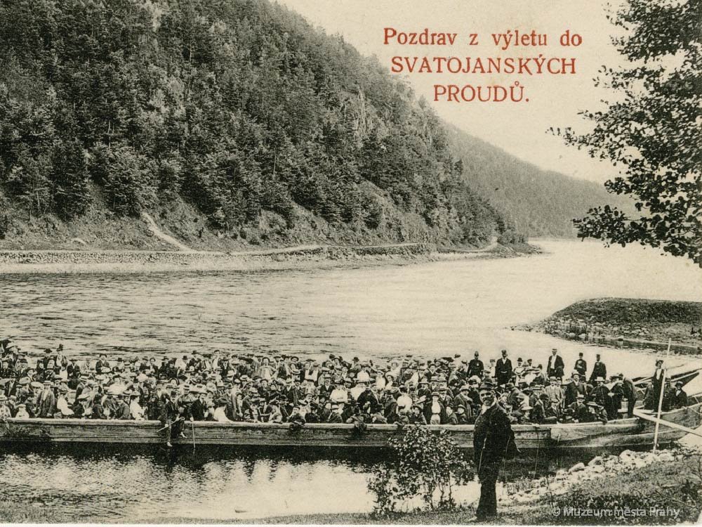 Dvě pramice s výletníky do Svatojánských proudů z pražských parníků jsou připraveny k odplutí u Horního slapu. V pozadí je vidět potahová stezka, které zde šla po pravém břehu Vltavy. Pohlednice odeslaná 7. 6. 1909. Fotografoval A. F. Wanner, Štěchovice n. Vlt. MMP H 216 990.