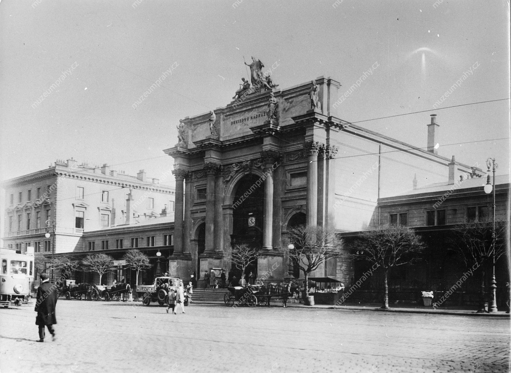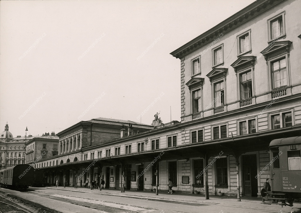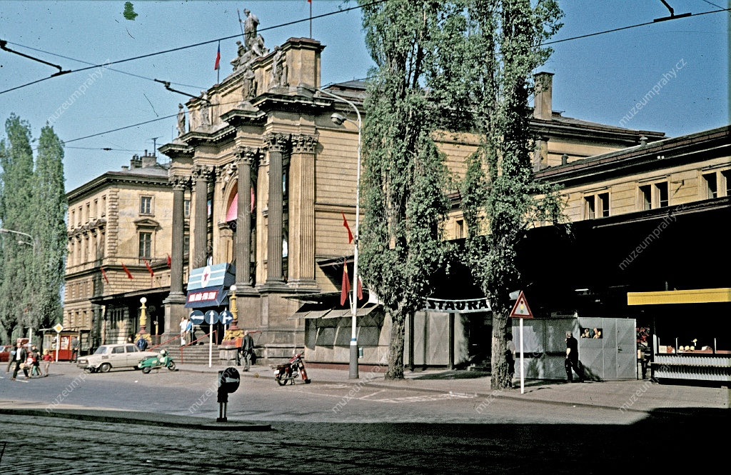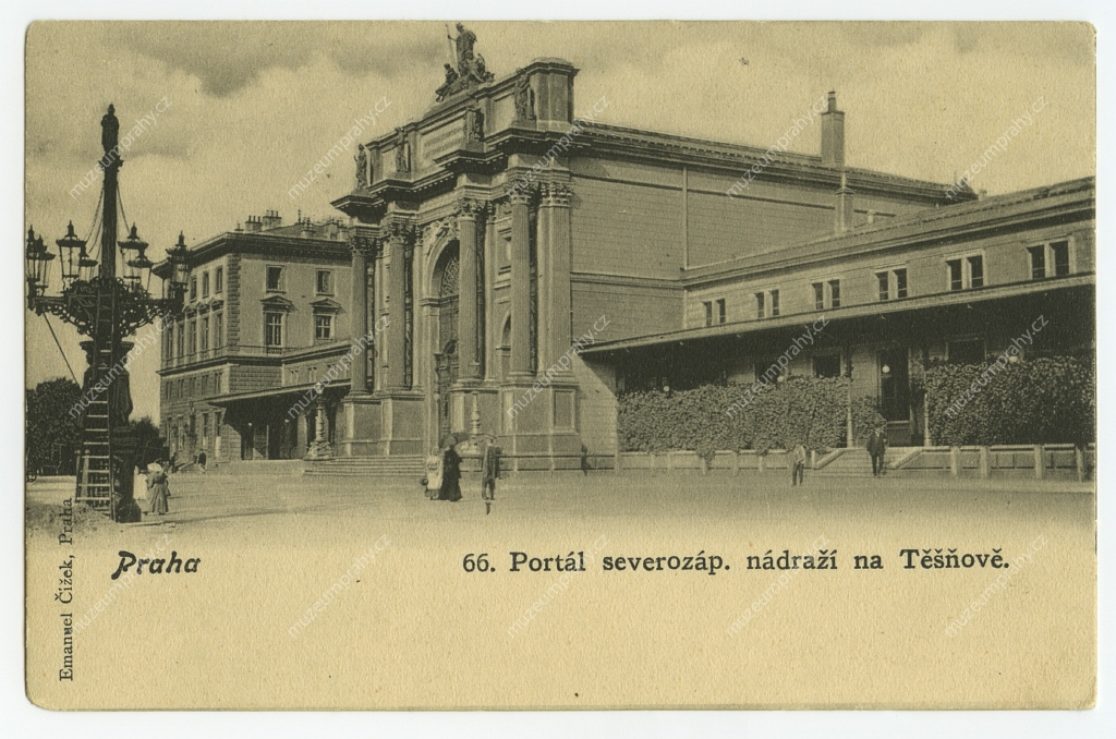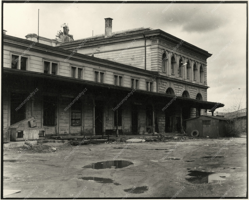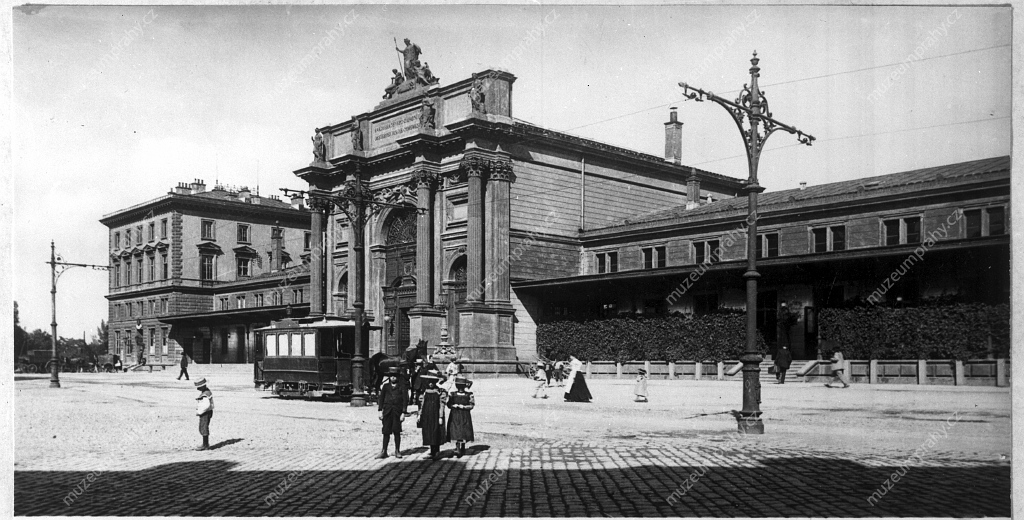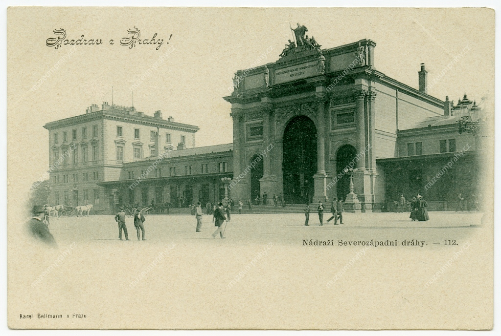 V květnu roku 1875 začalo v Praze fungovat nové nádraží. Nechala je vystavět významná železniční společnost Rakouská severozápadní dráha, která o dva roky dříve propojila svou rozsáhlou síť železničních tratí s Prahou. Novorenesanční budova navržená architektem Karlem Schlimpem v podobě vskutku velkorysé, byla roku 1876 v časopise Světozor výstižně charakterizována: „Vůbec jest budova stavbou velkolepou, k účelům svým dobře příhodnou a slouží Praze k nemalé okrase". Vznosnou architekturou vynikala zejména ústřední část nádražní budovy, jejíž průčelí bylo pojato jako klasický vítězný oblouk se čtyřmi sloupy, na nichž byly umístěny sochy znázorňující obchod, vědu, průmysl a hospodářství. V nejvyšší části se nacházelo sousoší zobrazující průmysl a rolnictví, nad nimž se vypínala Austrie jako jejich ochránkyně. Stejně honosně byly pojaty i vnitřní prostory odbavovací dvorany, což opět dokládá časopis Světozor: „Vůkol jsou znaky hlavnějších stanic dráhy severozápadní, a sice hned nad vchodem znak Prahy a Vídně, po obou stranách Znojma, Jihlavy, Německého Brodu, Kutné Hory, Kolína, Litoměřic, Ústí nad Labem, Děčína, Trutnova, Hostinného, Mladé Boleslavi, Jičína, Králové Hradce, Chlumce, Nymburka a Lysé. U znaků měst českých jsou nápisy české, u německých německé, jen města Lysou a Nymburk anektovali pro němectví a napsali tam nápisy po Německu. Znaky jsou vkusně malovány. Dále nalézá se ve vestibule veliká mapa zemí rakouských a německých a zemí pohraničných. Čekárna pro I. a II. třídu jest zařízena velmi elegantně; sedadla jsou potažena zeleným aksamitem, stoly jsou mramorové. Na stropě nalézají se skvostné arabesky. Také restaurace a čekárny III. a IV. třídy jsou slušně zařízeny" (Světozor, rok 1876, č. 44, s. 591).