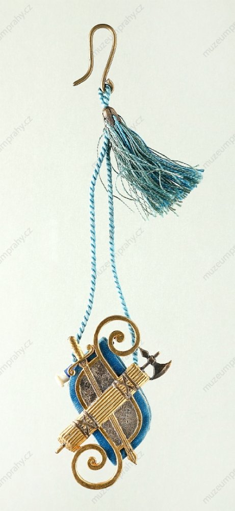 Taneční pořádek ve formě stočené listiny v tubusu s právnickými emblémy, Ples pražského spolku právníků Všehrd, 13. 3. 1884, knihařství K. Just, Praha,