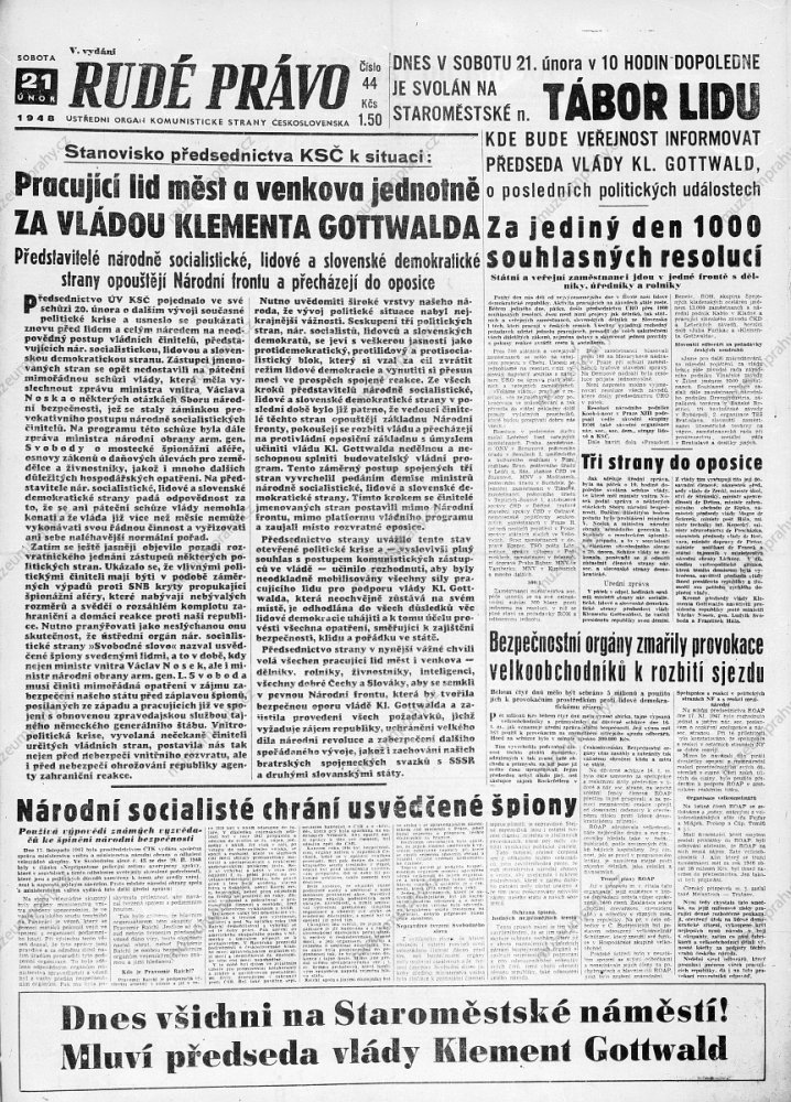 Title page of Rudé právo on 21 February 1948. A report on the attitude of the Communist Party of Czechoslovakia and call for a demonstration. MMP HNS 000 099/061.