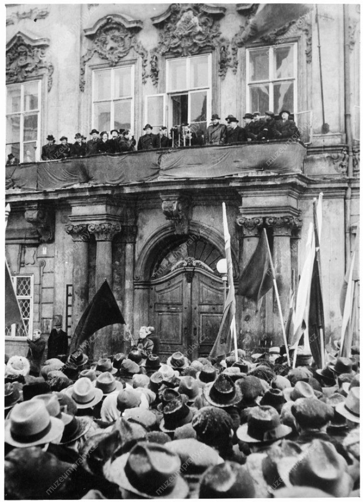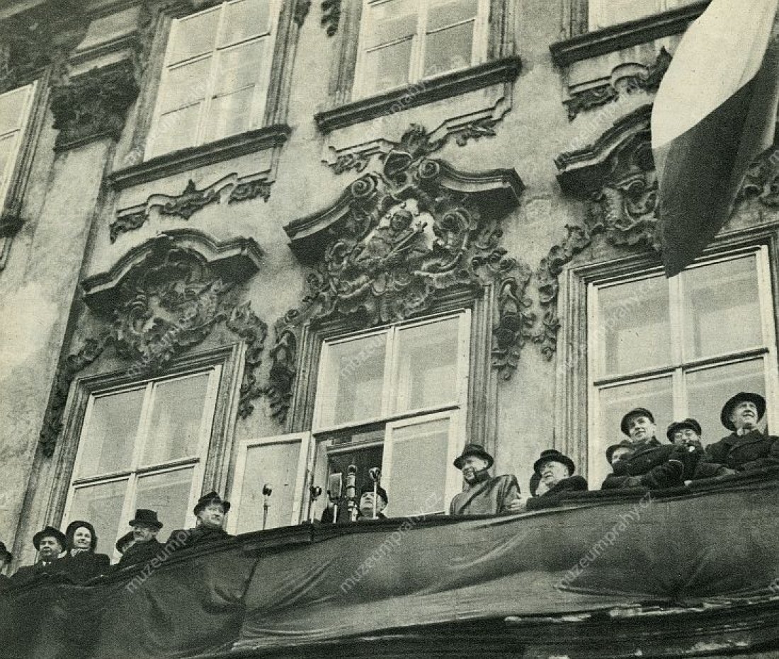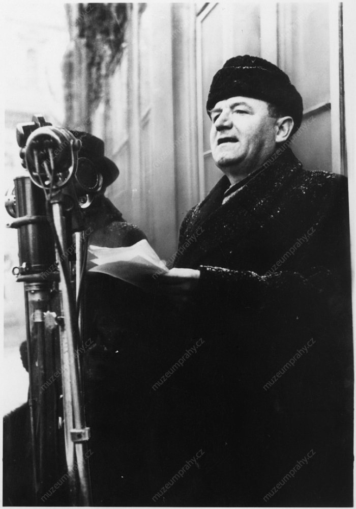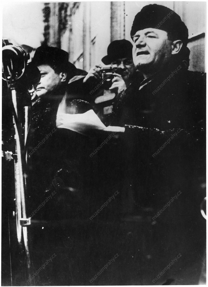 Prime Minister Klement Gottwald informs the public that President Edvard Beneš accepted the resignations of non-communist ministers. 25 February 1948, MMP H 198 751; In the presence of his party co-members, Prime Minister Klement Gottwald informs the crowd about the results of his meeting with President Edvard Beneš, MMP H 044 098/035.