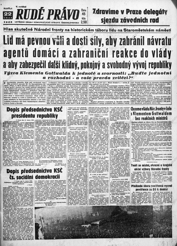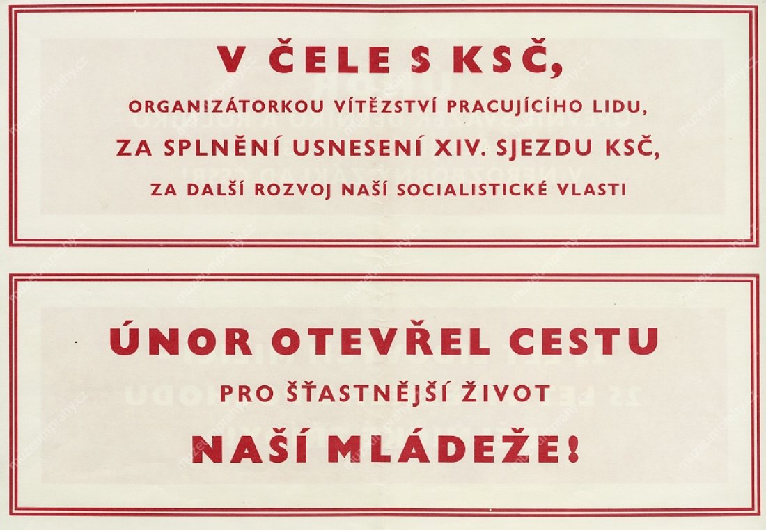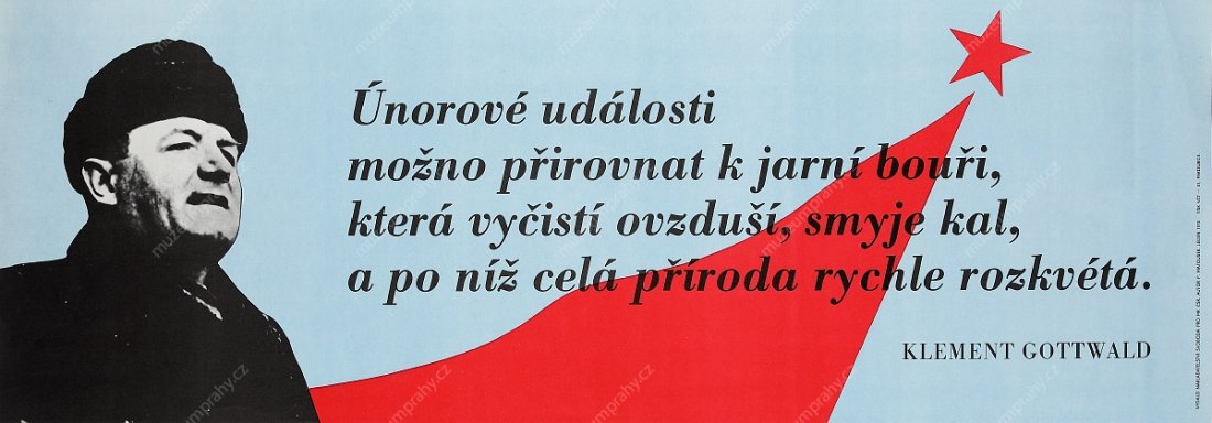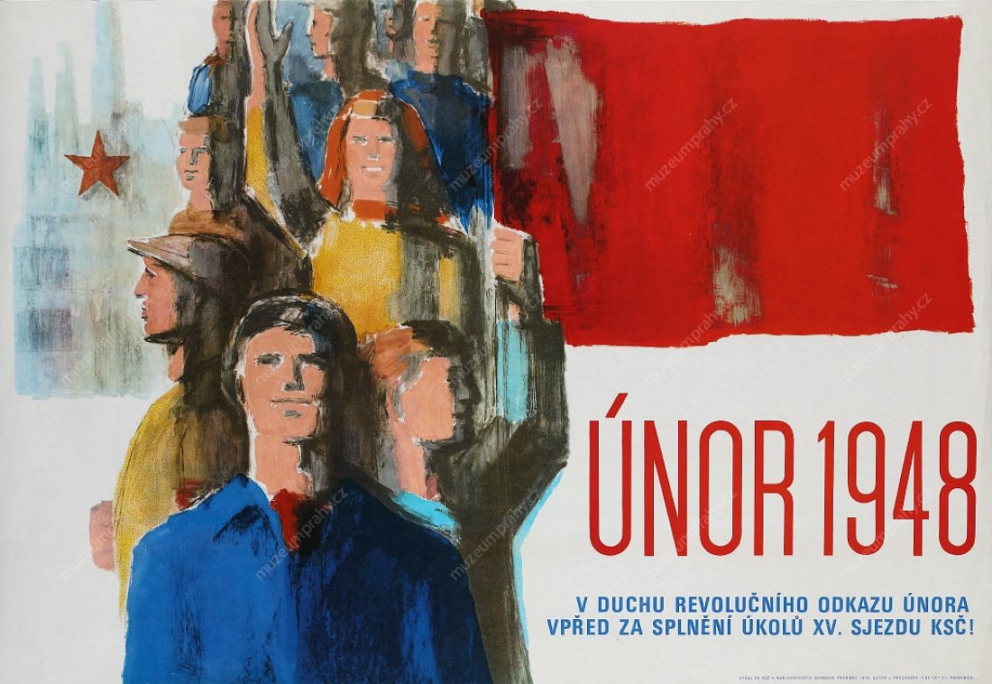 This wording, which so aptly characterised the last round of the struggle for power in Czechoslovakia at the end of February 1948, appeared on a propaganda poster of the artist Jiří Kodejš referring to the 25th anniversary of 'Victorious February'. It was one of the cardinal moments of Czechoslovakian history that adumbrated the entire second half of the 20th century. The circumstances of the stimulation of the coup in Czechoslovakia must be understood in the context of after-war political changes, as a consequence of the inclusion of Czechoslovakia in the influential sphere of the contemporary Soviet Union and the enormous growth of the membership base of the Communist Party of Czechoslovakia. The populist programme, supported by social agitations and pro-Soviet post-war pathos, brought a swift first success after the national committee elections in May 1946 where the communists achieved the highest representation in the newly elected local national committees (communists – 108 members, national socialists – 92, social democrats – 89, People's Party – 54, without party affiliation – 23).