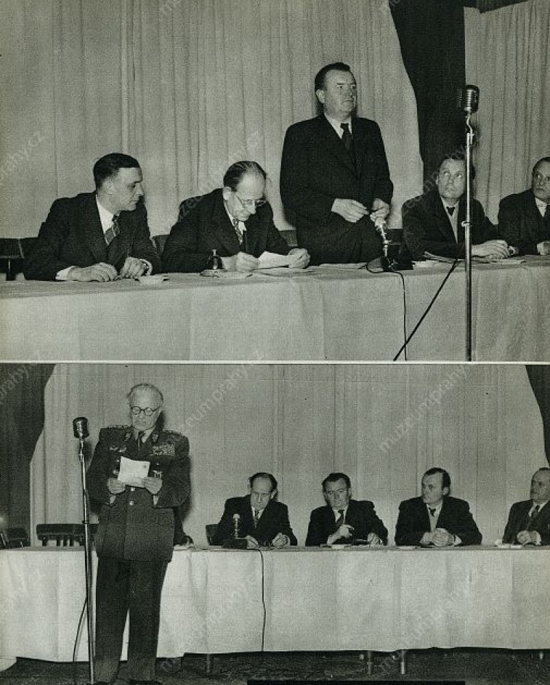 Roundup in the secretariat of the Czech National Socialist Party in the Melantrich building at Wenceslas Square, MMP H 044 098/019 – cut-out.; Meeting of the Central Action Committee of the National Front. 23 February 1948, MMP H 044 098/019 – cut-out..