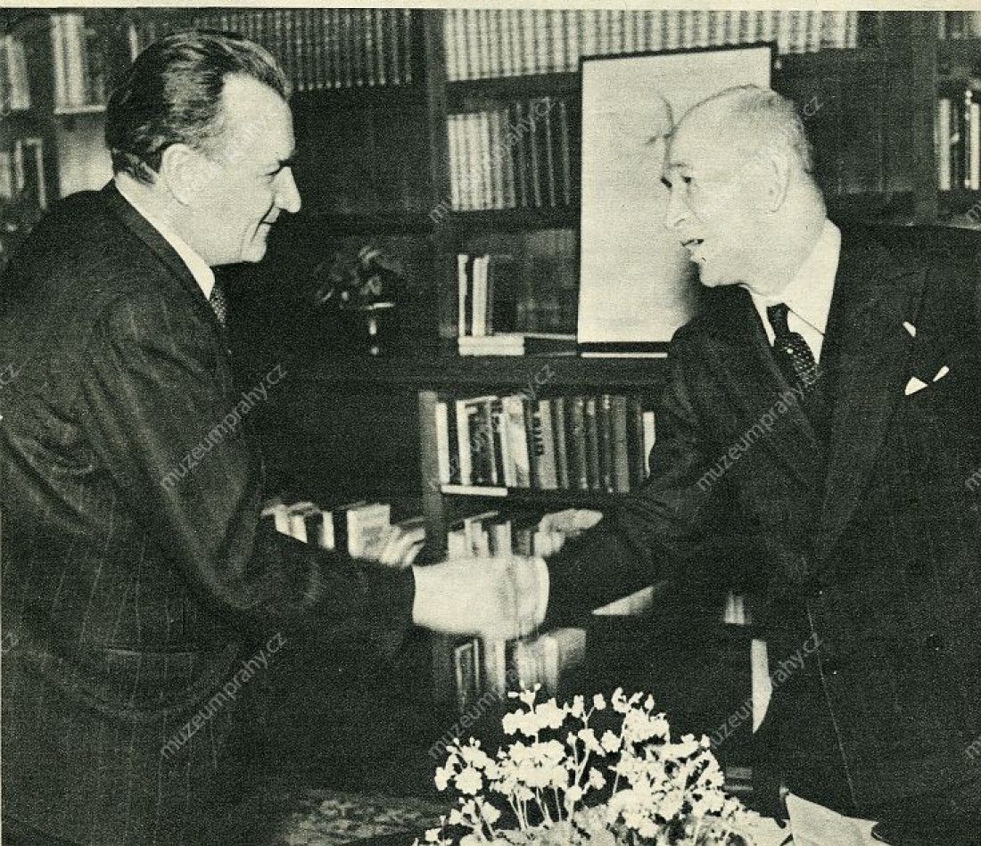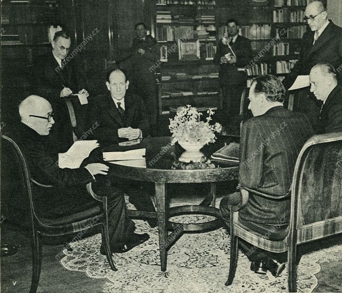 Negotiating the proposed resignations of the non-communists at the round table in the president’s office at Prague Castle. From left: Edvard Beneš, Antonín Zápotocký, Klement Gottwald, Václav Nosek, MMP H 240 247; PPrime Minister Klement Gottwald and President Edvard Beneš having signed the resignations of non-communist ministers, MMP H 200 247/021.