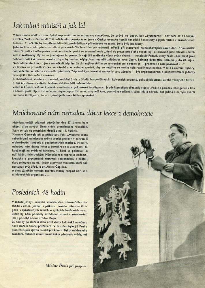 Workers are informed about the resolution of the national congress of works committees at the Tatra Smíchov national enterprise, MMP HNS 000 264/060; Current political events and responses to them in Rudé právo newspaper. 23 February 1948, MMP HNS 000 921/061.
