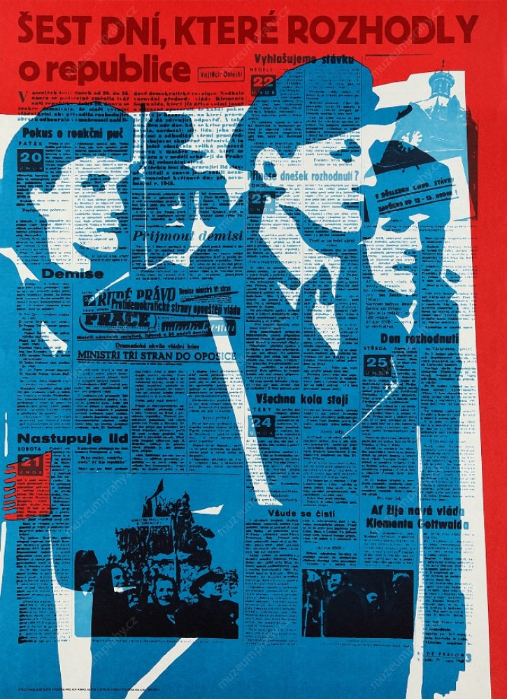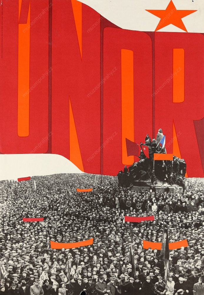 Propaganda poster published for the 6th anniversary of Victorious February (1948–1954), MMP H 200 100/010; Poster for the 25th anniversary using a photomontage from the speech of Klement Gottwald in Old Town Square in Prague on 21 February 1948. Created by Fr. Kraus. Published by Svoboda for ÚV KSČ, 1973. Printed by SG 2, MMP H 088 949.