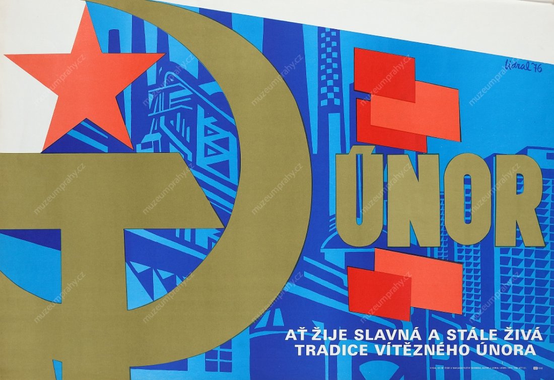 Poster for the 29th anniversary. Created by J. Lidral. Published by ÚV NF ČSSR at Svoboda,1977. Printed by VČT 01.; Poster for the 30th anniversary of Victorious February published for the 15th Congress of the Communist Party of Czechoslovakia. Created by J. Procházka, 1978, Pardubice, MMP H 118 544.
