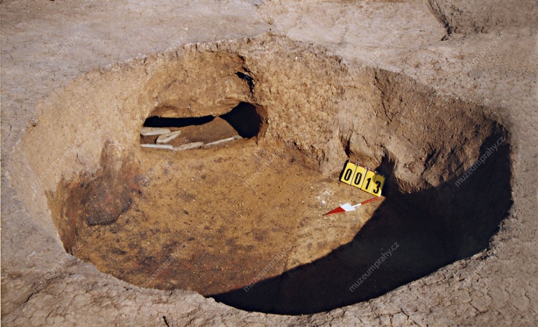 Obr. 2: Sídlištní jáma s výklenkem, v němž byl uložen depot kamenných nástrojů