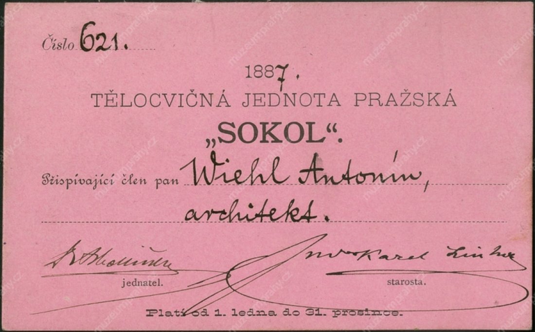 Průkaz tělocvičné jednoty Sokol architekta Antonína Wiehla (1846-1910) z roku 1887, MMP H 59 427.