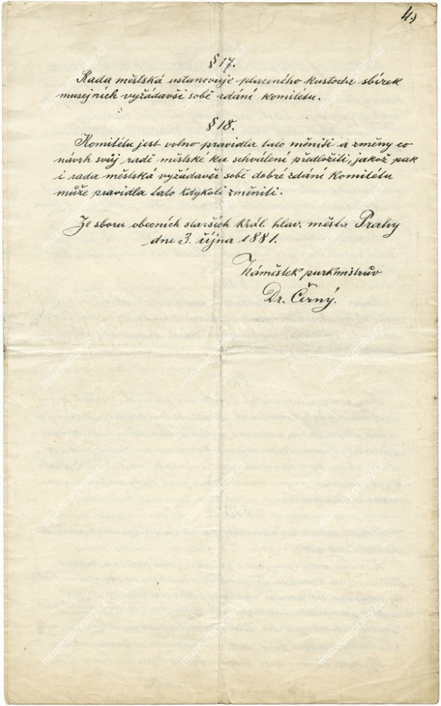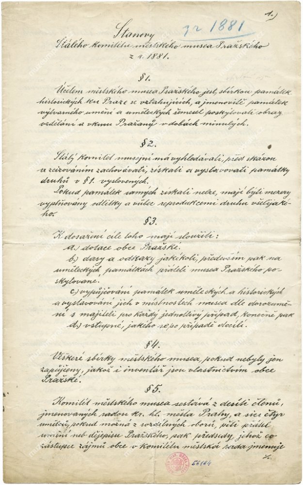 Zatím pracovala zvláštní komise pro založení městského muzea a výsledkem jejího úsilí bylo zřízení stálého komitétu a schválení Pravidel stálého komitétu městského musea Pražského onoho 3. října 1881. V prvních čtyřech paragrafech tu byl poprvé deklarován účel pražského městského muzea, jeho cíle a prostředky k nim vedoucí: