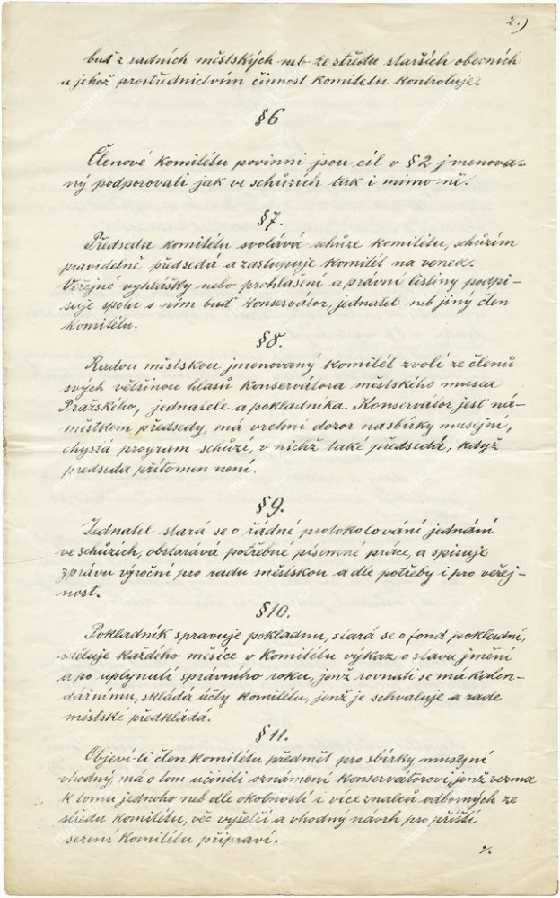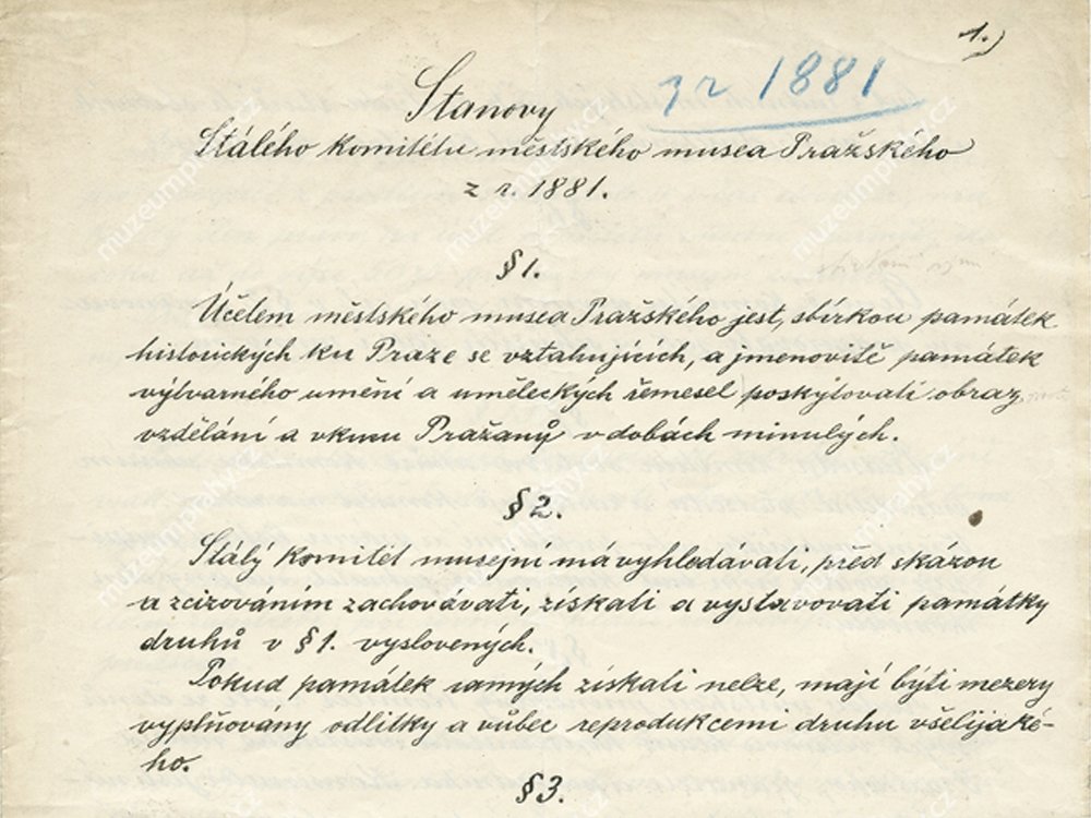 Par. 1 Účelem městského musea Pražského jest, sbírkou památek historických ku Praze se vztahujících a jmenovitě památek výtvarného umění a uměleckých řemesel poskytovati obraz vzdělání a vkusu Pražanů v dobách minulých.