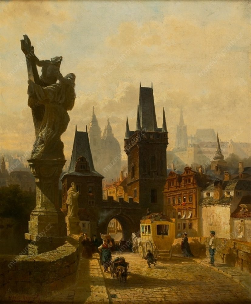 Rozvoz mléka v Dušní ulici zachycený na dobové malbě z 90. let 19. stol., autor Oscar Rex (26. 3. 1857 – 8. 2. 1929), olej na plátně, MMP H 044.124.