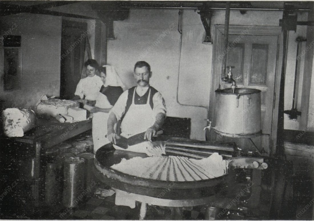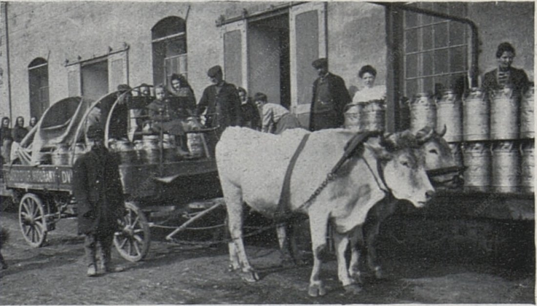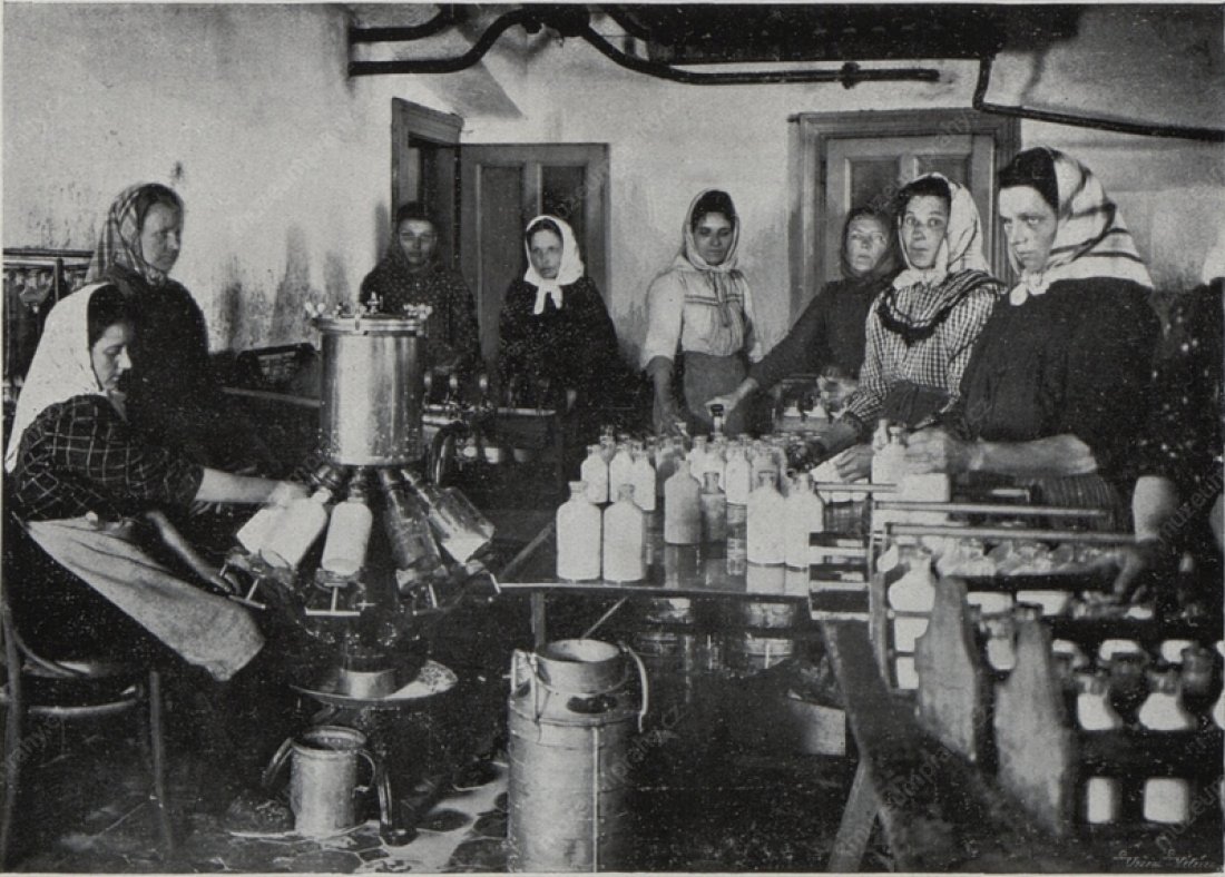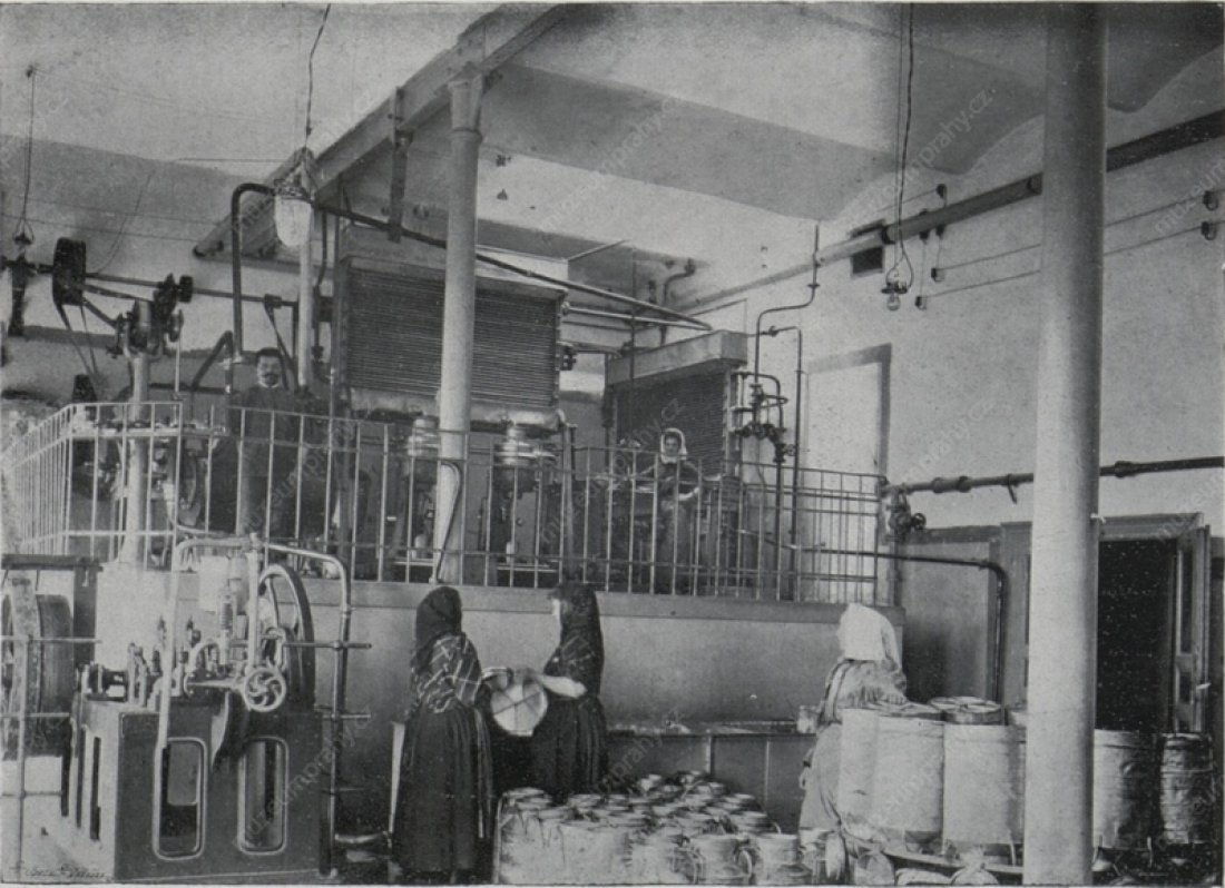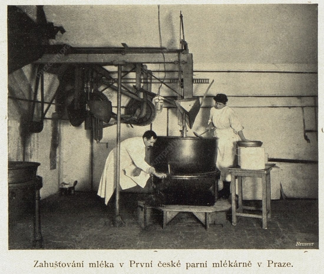 Vykládání mléka dovezeného z venkovských dvorů, foto Jiří Freund, kolem roku 1908–1909, reprint Český svět 26, 1909, MMP; Výroba tzv. Backhausova dětského mléka. Ošetření mléka spočívalo v ohřívání při teplotě 103 stupňů po dobu 15 minut, k čemuž sloužila ohřevná skříňka vpravo. Foto Jiří Freund, kolem roku 1908–1909, reprint Český svět 26, 1909, MMP.