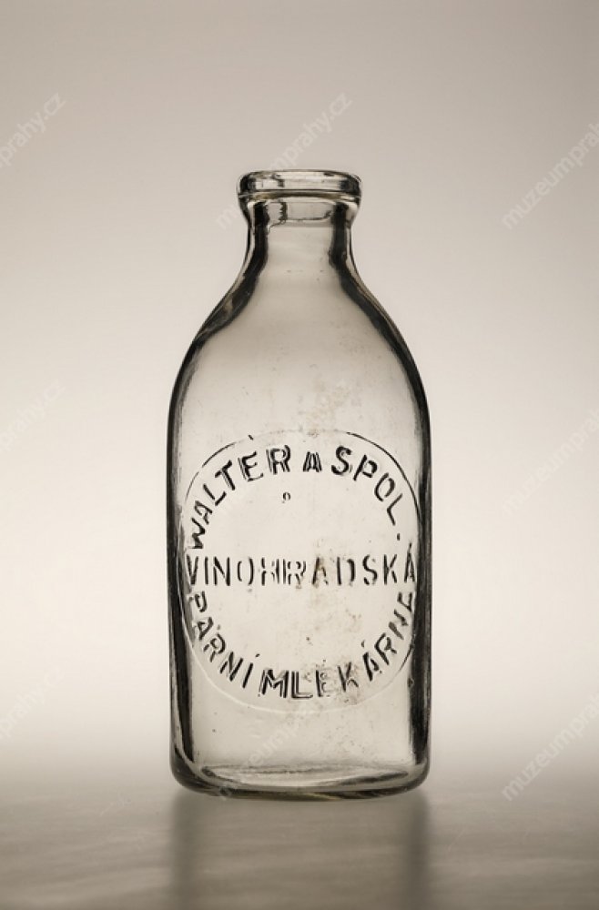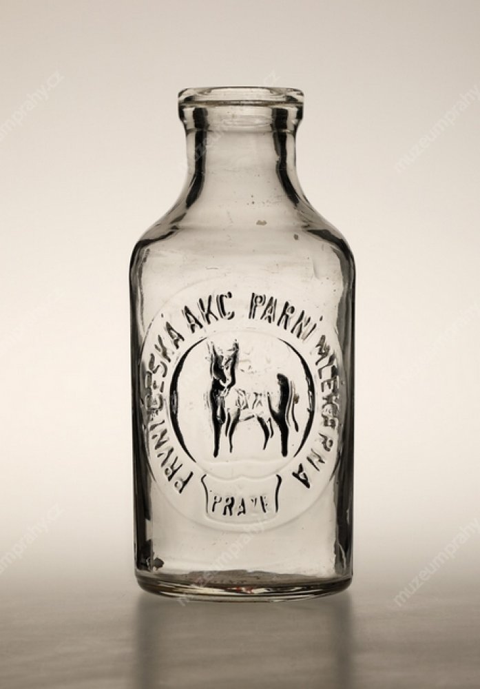Láhve Pražských mlékáren zhotovené ve 30. letech 20. století. Litrový exemplář vlevo je výrobkem sklárny Mühlig-Union Teplice, třičtvrtě litrový vpravo pochází ze sklárny Carl Stölzle's Söhne Praha (Heřmanova Huť). MMP H 226 196 a 137 981.