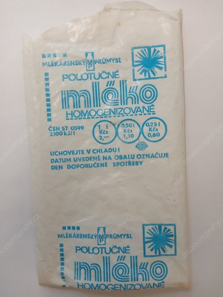 Polyethylenový obal od polotučného mléka Mlékárenského průmyslu, n. p., výrobce obalu v.d. Směr, 1. pol. 80. let 20. stol., MMP H 339 538; Polyethylenový polotovar používaný při balení mléka v továrním balícím stroji. Logo výrobku – plnotučné mléko Mlékárenského průmyslu, n.p., výrobce obalu v.d. Směr, 1. pol. 80. let 20. stol., MMP H 329 192.
