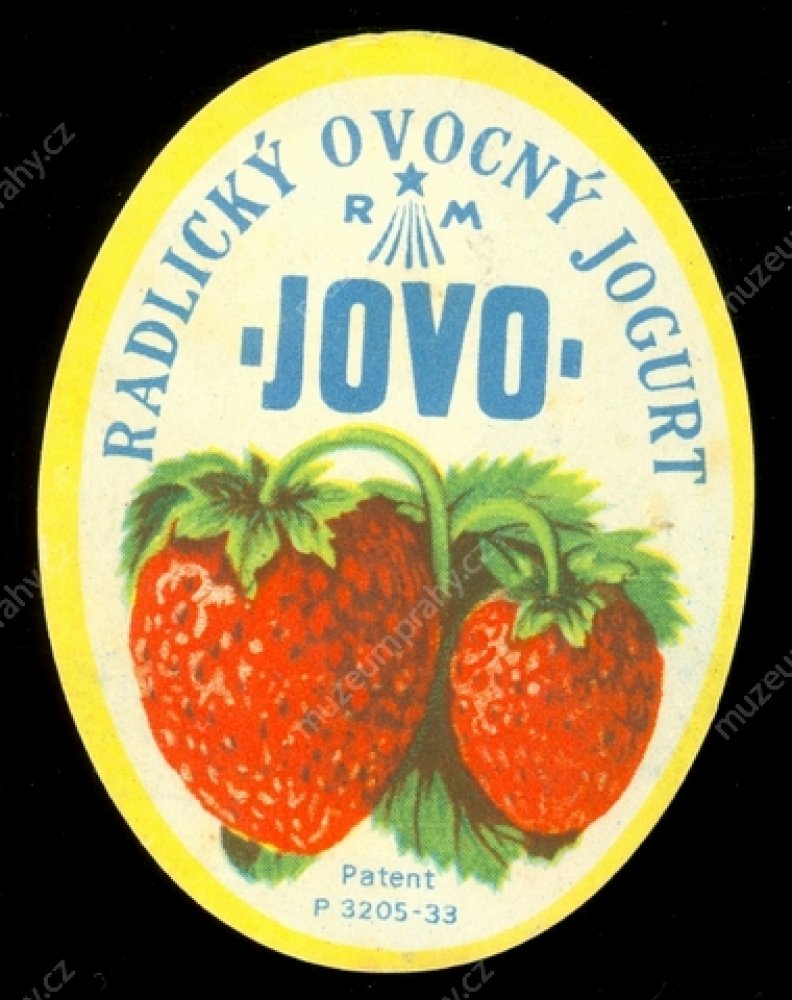 Reklamní nálepky od ovocného jogurtu Radlické mlékárny, 30. léta 20. stol., MMP H 143 054–56. Nově používaný ovocný džem s jahodovou či meruňkovou příchutí měl omezit kyselost jogurtu a zamezit vzniku plísní. Mlékárna si nechala tento výrobek z roku 1933 patentovat a jeho licenci převzaly další podniky v 15 zemích Evropy. Od roku 1934 se po zavedení pasterace začala džemová vrstva dávat na dno jogurtových sklenic.