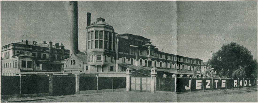 Smíchovská provozovna Akciové společnosti pro průmysl mléčný v Praze (Radlická mlékárna) na reprodukovaném propagačním tisku, březen 1936, MMP H 243 111.
