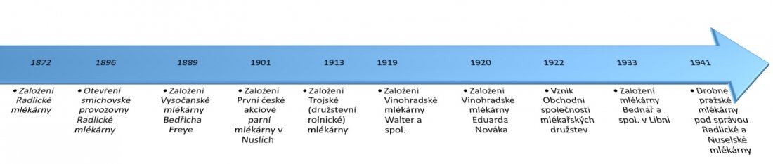 Počátky pražského mlékárenského průmyslu úzce souvisejí s proměnou společnosti české metropole a její aglomerace v druhé polovině 19. století. Enormní nárůst počtu obyvatel si vyžádal změnu dosavadního způsobu potravinového zásobování. To bylo nyní postaveno na širším okruhu menších i větších firem, nově se formujících drobných živnostech, ale i kapitálově silných podnicích. Od 70. a 80. let 19. století se mezi ně zařadily i první české mlékárny, zakládané na dvorech velkostatků, pivovarů, ale i v nově vystavěných objektech, které měly pokrýt zvyšující se poptávku po mléčných výrobcích v Praze a dalších městech rakouské monarchie.