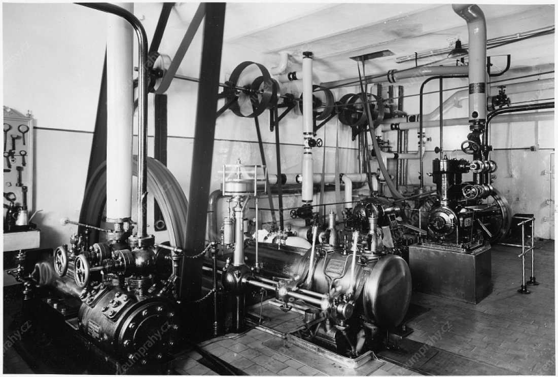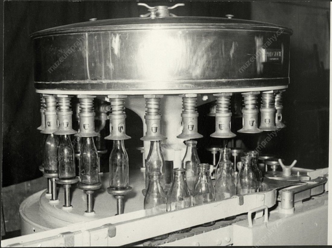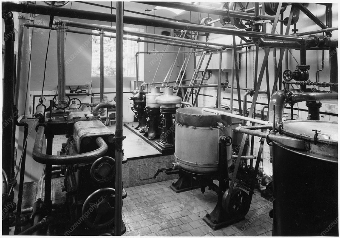 Pohled na plnění láhví mlékem v automatizované lince vysočanské provozovny podniku Laktos, n. p., kolem roku 1960, MMP H 235 992; Pohled do strojovny Vysočanské mlékárny. Fotografie pořízena u příležitosti 50. výročí založení podniku v roce 1935, MMP H 320 463.