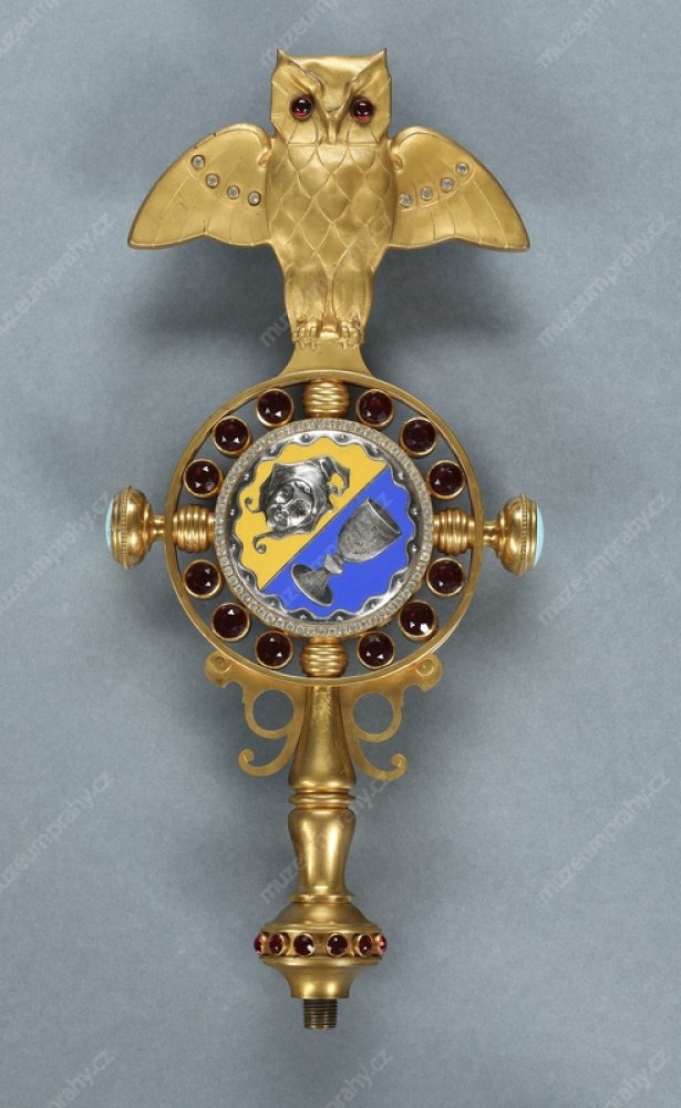 Pozlacený vrchol žezla nebo korouhve se smaltovaným znakem Schlaraffie a schlaraffským heslem „In arte voluptas" (V umění rozkoš). MMP HD 002 445/001; „Orden pro litteris et artibus“ – řád Schlaraffie za mimořádné služby na poli literárním a uměleckém. MMP HD 002 462