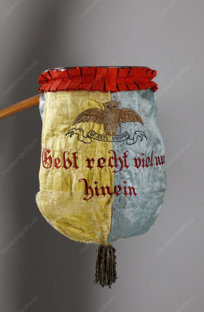 Dyndálek (Klingelbeutel) s vyšitými schlaraffskými symboly – výrem a heslem „In arte voluptas" (V umění rozkoš), určený k vybírání peněz. K velkorysosti v obdarovávání vyzývá červeně vyšitý nápis „Gebt recht viel nur hinein" (Stačí dát hodně). MMP HD 002 452/003
