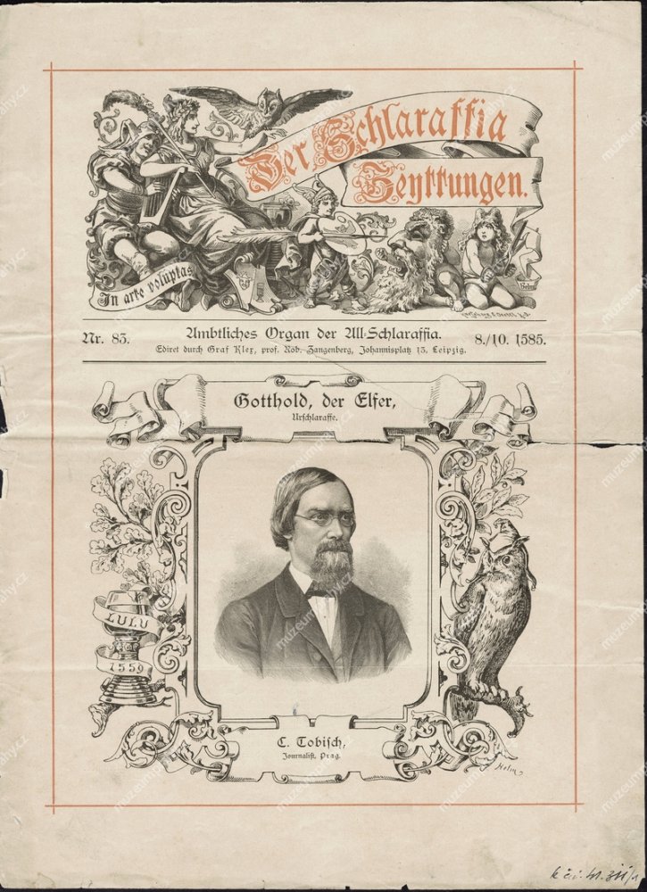 Der Schlaraffia Zeyttungen, Nr. 83, 8. 10. 1585 (1885). Na titulním listu je jeden z otců-zakladatelů redaktor Carl Tobisch (rytíř Gotthold der Eilfer). MMP H 041 311/001