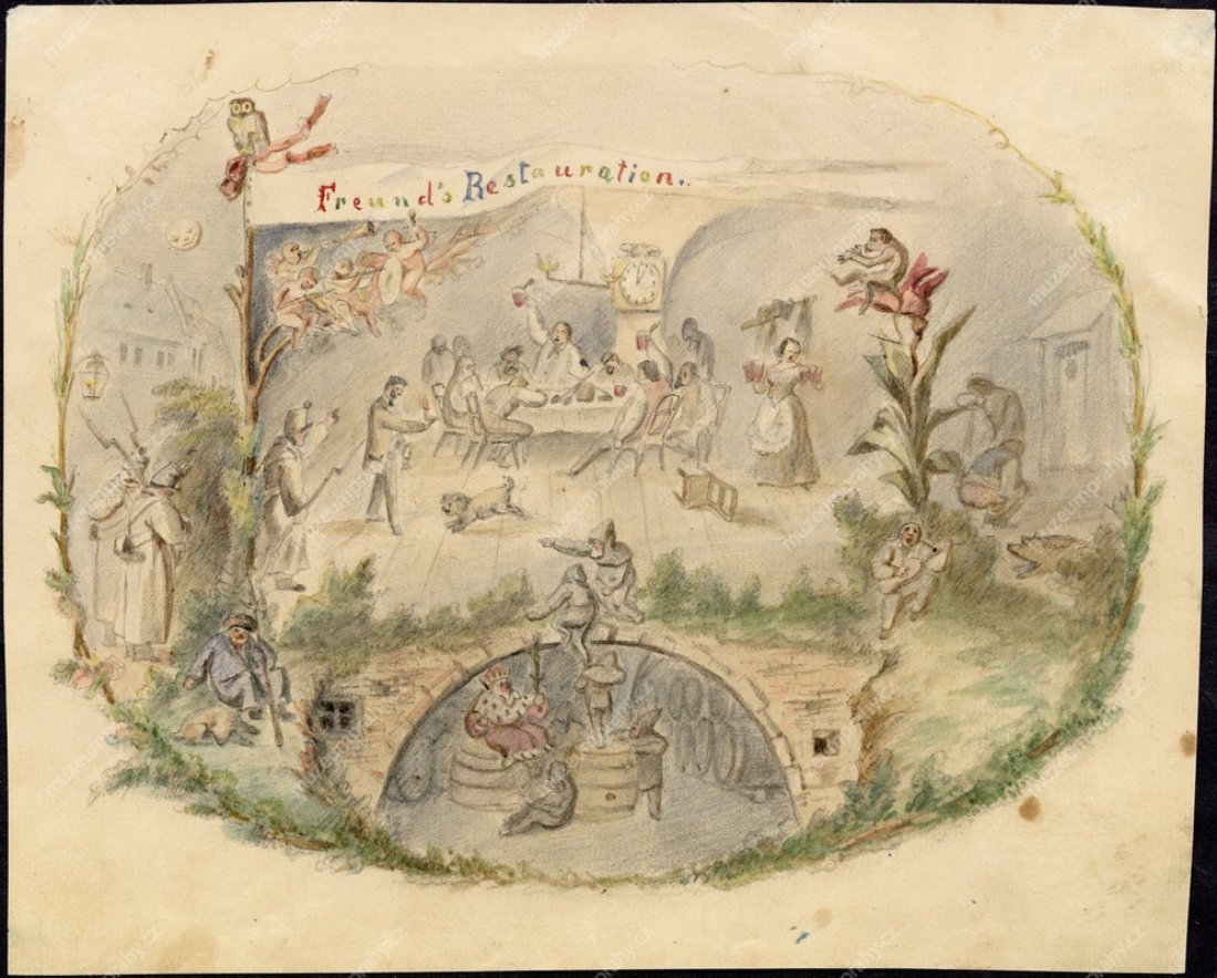 Stylizovaná kolorovaná kresba restaurace U Freundů, kde došlo v roce 1859 k založení Schlaraffie. Restaurace se nacházela na rohu ulic Vodičkova a V Jámě. MMP H 037 852/017