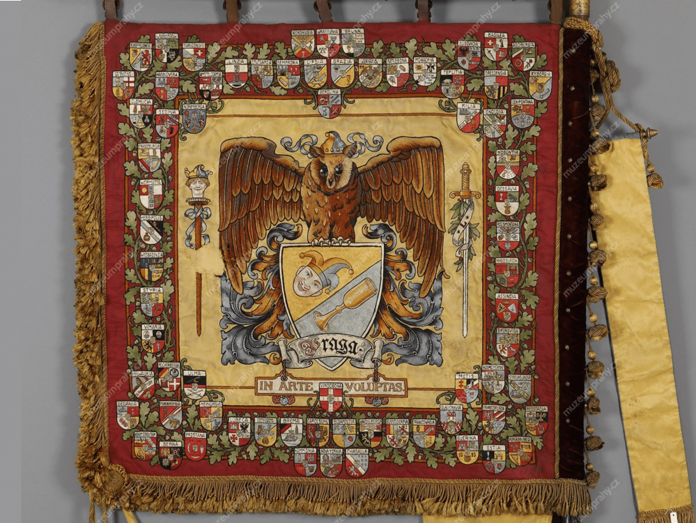 Korouhev z moaré hedvábí schlaraffské pražské Všemáti (Allmutter Praga), vyšívaná. Líc: znak Allmutter Praga, po okraji znaky odnoží Allschlaraffie. Rub: v ozdobném rámci vyšitý nápis „Der hohen Allmutter Praga die Allschlaraffia aus Anlass ihres 50jährigen Wiegenfestes A.U. 50" (Velké Všemáti Praze Allschlaraffia u příležitost 50. výročí jejího zrodu A.U. 50), po okraji znaky odnoží Allschlaraffie. Součástí kovová litá žerď, završená figurou sovy a opatřená ramenem k zavěšení korouhve, 1909. MMP HD 002 444/002 a/008