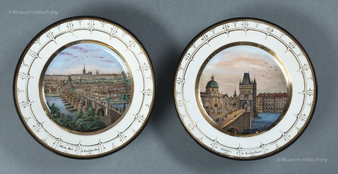 Talíř s motivem Karlova mostu a hradčanského panoramatu, po 1868, glazovaný, malovaný, zlacený porcelán, p. 22 cm, vyrobeno ve smíchovské porcelánce, značka výrobce Prag, sbírka MMP, inv. číslo H 033 572