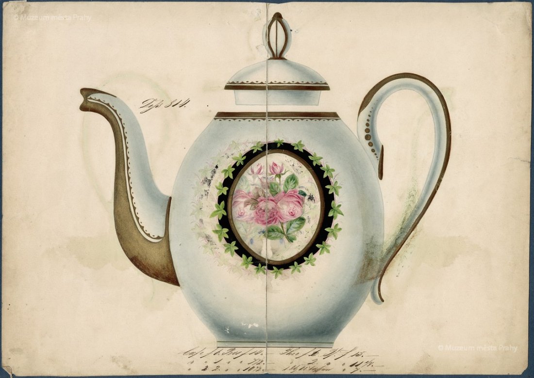 List ze vzorníku smíchovské porcelánky (kávová konvice), po 1850, kolorovaná kresba na papíře, 26,6 × 37,6 cm, sbírka MMP, inv. číslo H 023 220/008