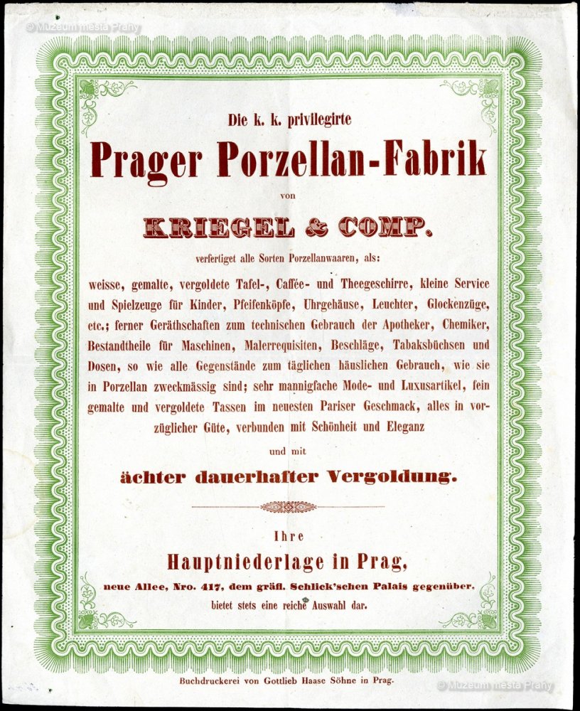 Reklamní leták porcelánky Kriegel & Comp., hlavní sklad v Nových alejích č. p. 417, patrně 1842–1843, tisk Gottlieb Haase Söhne, Praha, 27,4 × 22,1 cm, sbírka MMP, inv. číslo H 036 414
