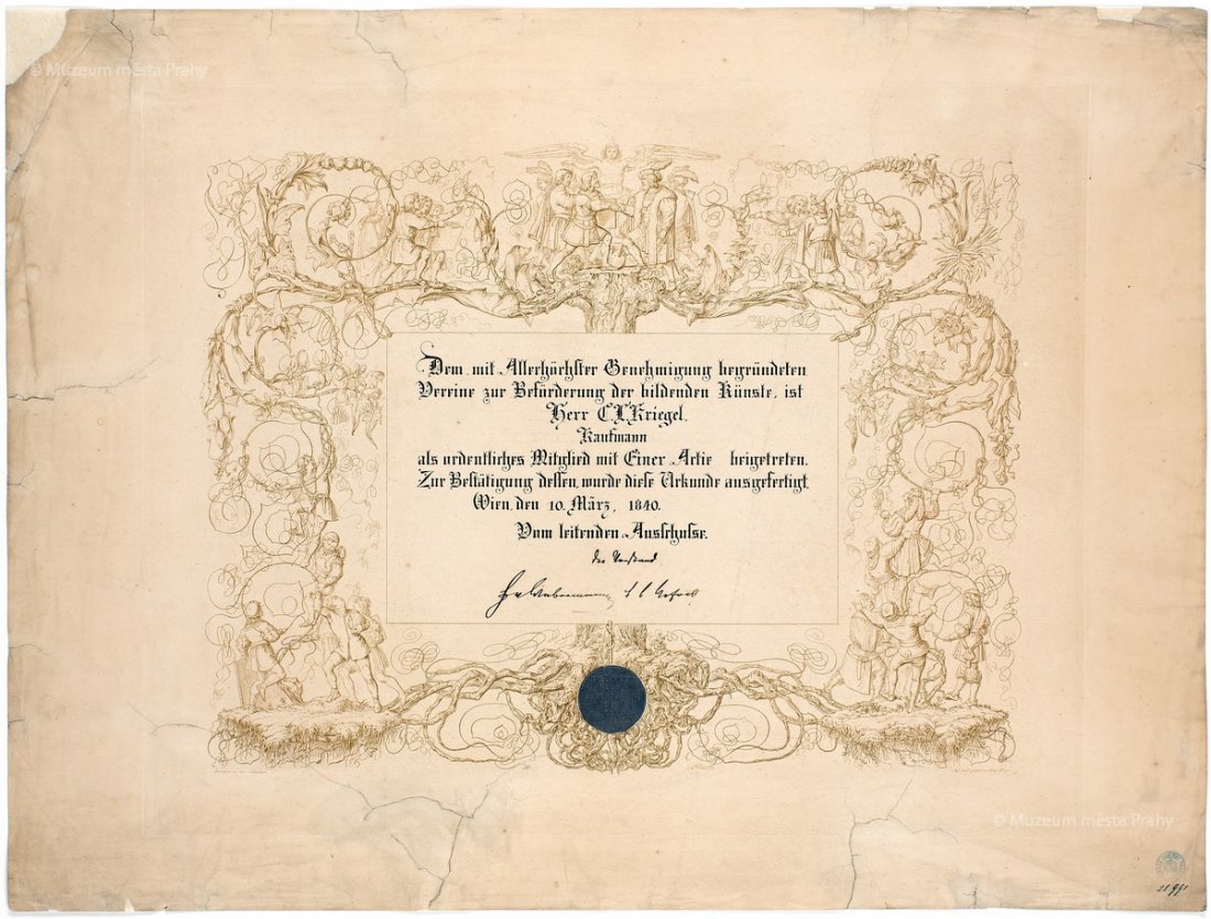 Diplom pro C. L. Kriegela, datovaný 10. březnem 1840, vydal Verein zur Beförderung d. bildenden Künsts (Spolek na pozdvihnutí výtvarného umění), Vídeň, orámování provedeno ocelorytem od Leopolda Beyera, 50 × 66,5 cm, sbírka MMP, inv. číslo H 028 991