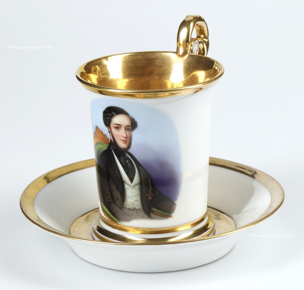 Johann Quast (připsáno): Koflík s portrétem českého místodržitele arcivévody Štěpána Habsburského, patrně 1844–1847, glazovaný, malovaný, zlacený porcelán, v. 10,7 cm, surovina vyrobena ve smíchovské porcelánce, značka výrobce K&C PRAG, sbírka MMP, inv. číslo H 023 208