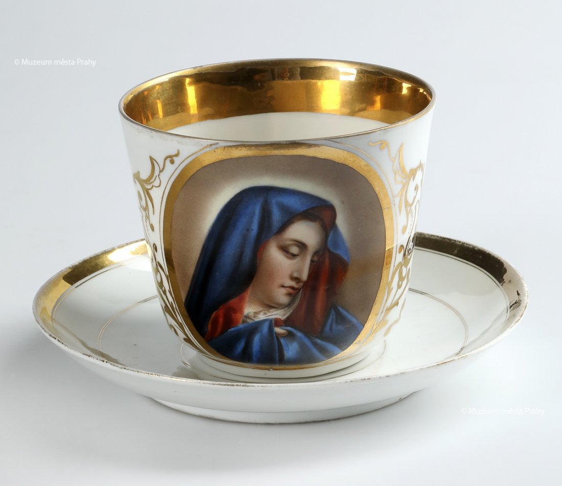 Johann Quast: Koflík s medailonem Panny Marie podle předlohy Quida Reniho, po 1852, glazovaný, malovaný, zlacený porcelán, v. 8,2 cm, surovina vyrobena ve smíchovské porcelánce, značka výrobce Prag, sbírka MMP, inv. číslo H 026 705