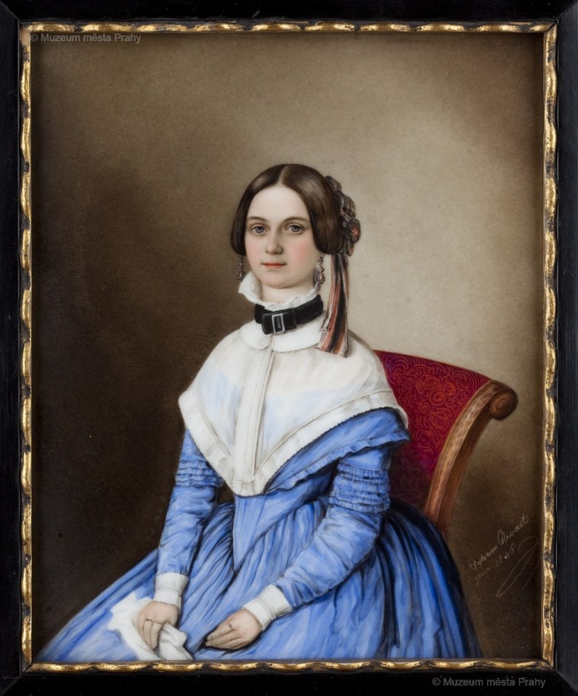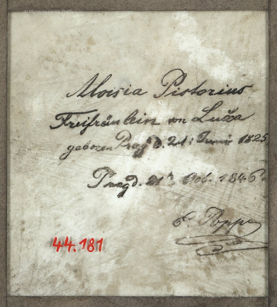 Johann Quast: Podobizna Aloisie Pistoriusové (líc a rub), 1846, malba na porcelánu, lakovaný a zlacený dřevěný rámeček, 18 × 14,5 cm, signováno Johann Quast pinx 1846, na zadní straně připsáno perem: Aloisia Pistorius, Freifreülein von Lucca, geboren Prag d. 21. Junii 1825. Prag d. 21ten Oct. 1846, E. Popp, sbírka MMP, inv. číslo H 044 181