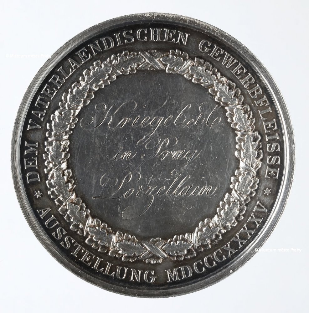 Tato stříbrná medaile byla již druhým oceněním pro výrobky Kriegelovy porcelánky z výstav pořádaných v metropoli mocnářství. Poprvé to bylo roku 1839 čestné uznání. Tento nedávno zakoupený přírůstek do muzejních sbírek je příkladem dokumentačních památek vztahujících se k průmyslu na území dnešní Prahy a jeho nadregionálnímu významu.