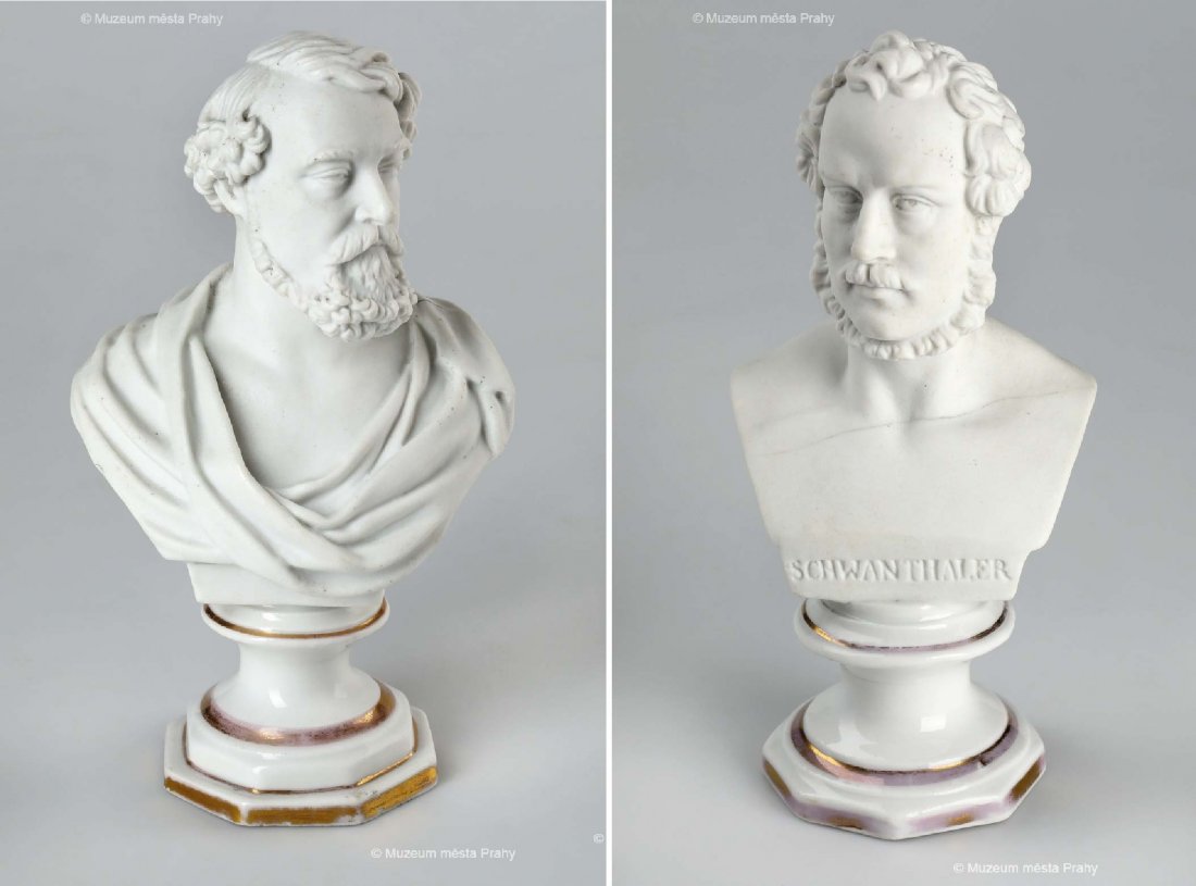 Ernst Popp: Portrét císařovny Elisabeth (Sissi) a císaře Franze Josefa I., kolem 1854, biskvit, částečně glazováno, zlaceno, v. 13,4 a 13,5 cm, vyrobeno ve smíchovské porcelánce, značka výrobce Prag, sbírka MMP, inv. číslo H 019 467 a 466