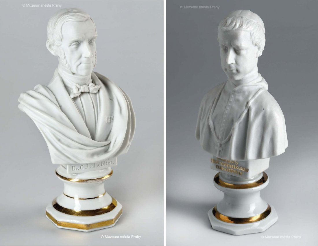 Ernst Popp: Portrét balneologa Dr. Karla Josepha Heidlera von Heilborn, 1858, biskvit, částečně glazováno, zlaceno, v. 15,5 cm, vyrobeno ve smíchovské porcelánce, značka výrobce Prag, značka modeléra E. Popp fec., na podstavci varianta jména Dr. C. J. v. Heidler, sbírka MMP, inv. číslo H 045 903