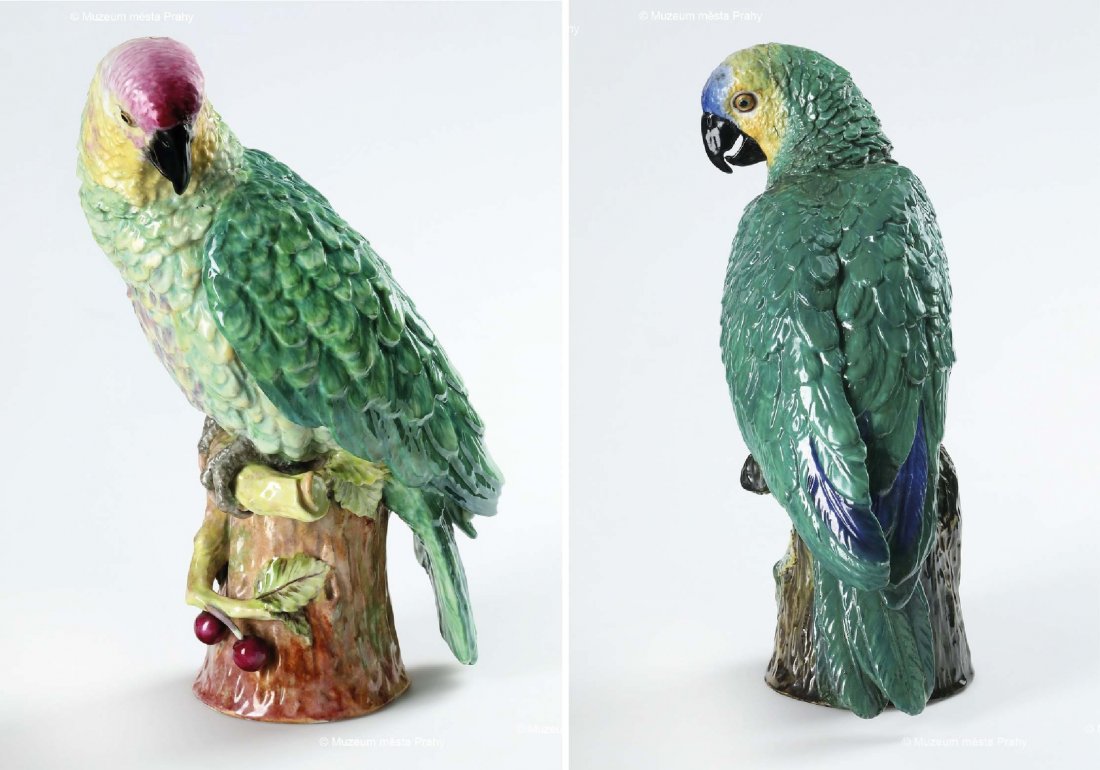 Ernst Popp: Papoušci, před 1852, glazovaný, malovaný porcelán, v. 26 a 26,7 cm, vyrobeno ve smíchovské porcelánce, značka výrobce K&C PRAG, značka modeléra Pp, sbírka MMP, inv. čísla H 054 664 a H 054 809