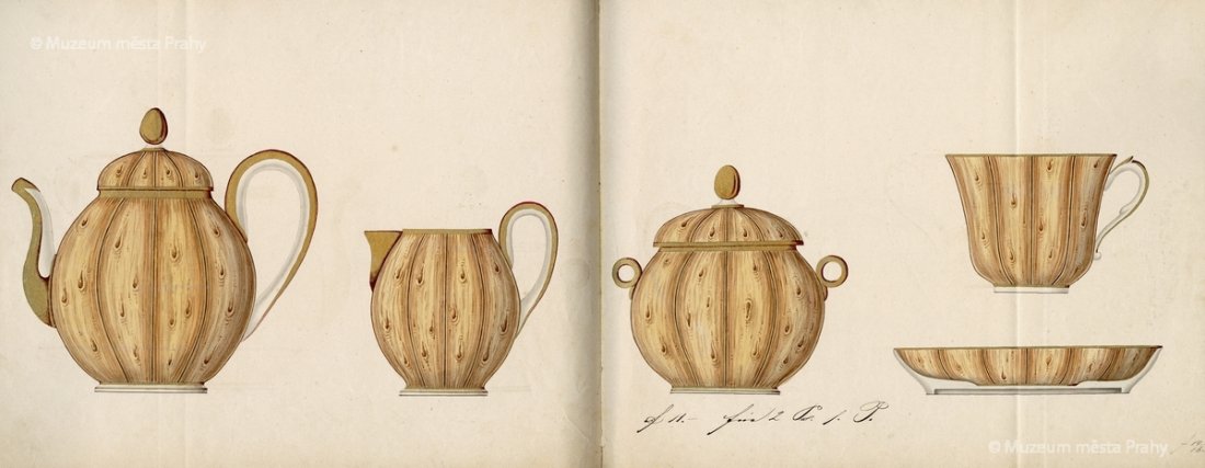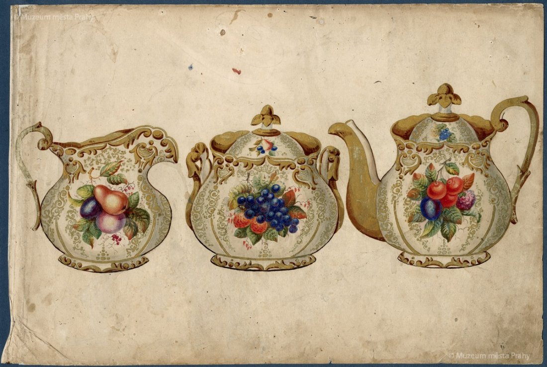 List ze vzorníku smíchovské porcelánky (mlékovka, cukřenka a kávová konvice), po 1850, kolorovaná kresba na papíře, 24,7 × 36,7 cm, sbírka MMP, inv. číslo H 023 220/001