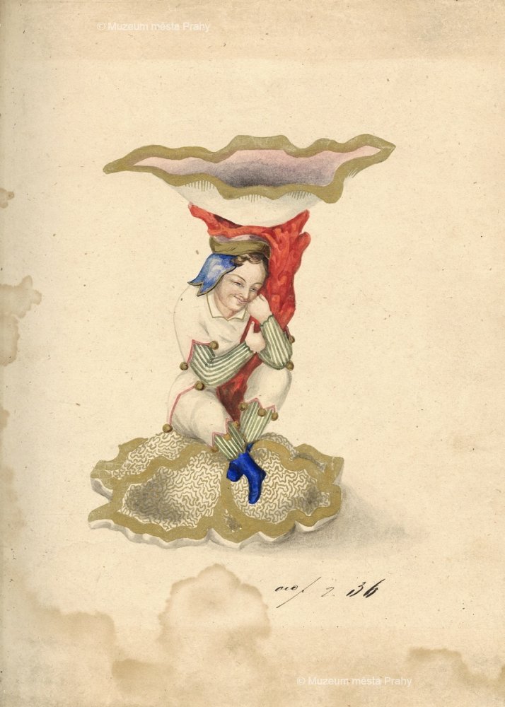 Listy ze vzorníku smíchovské porcelánky (nástolec s motivem šaška a hlavy panenek), po 1870, kolorované kresby na papíře, 29,5 × 22 a 23 × 30,5 cm, sbírka MMP, inv. číslo H 022 580/042 a 035