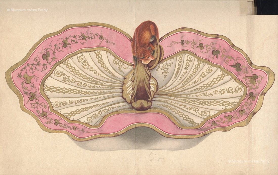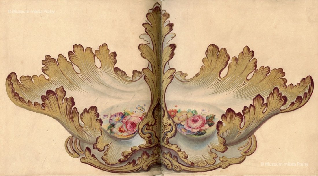 Listy ze vzorníku smíchovské porcelánky (mísa s motivem lišky, mísa s motivem růží), po 1870, kolorovaná kresba na papíře, 23 × 36 a 23,5 × 45 cm, sbírka MMP, inv. číslo H 022 580/044 a 041