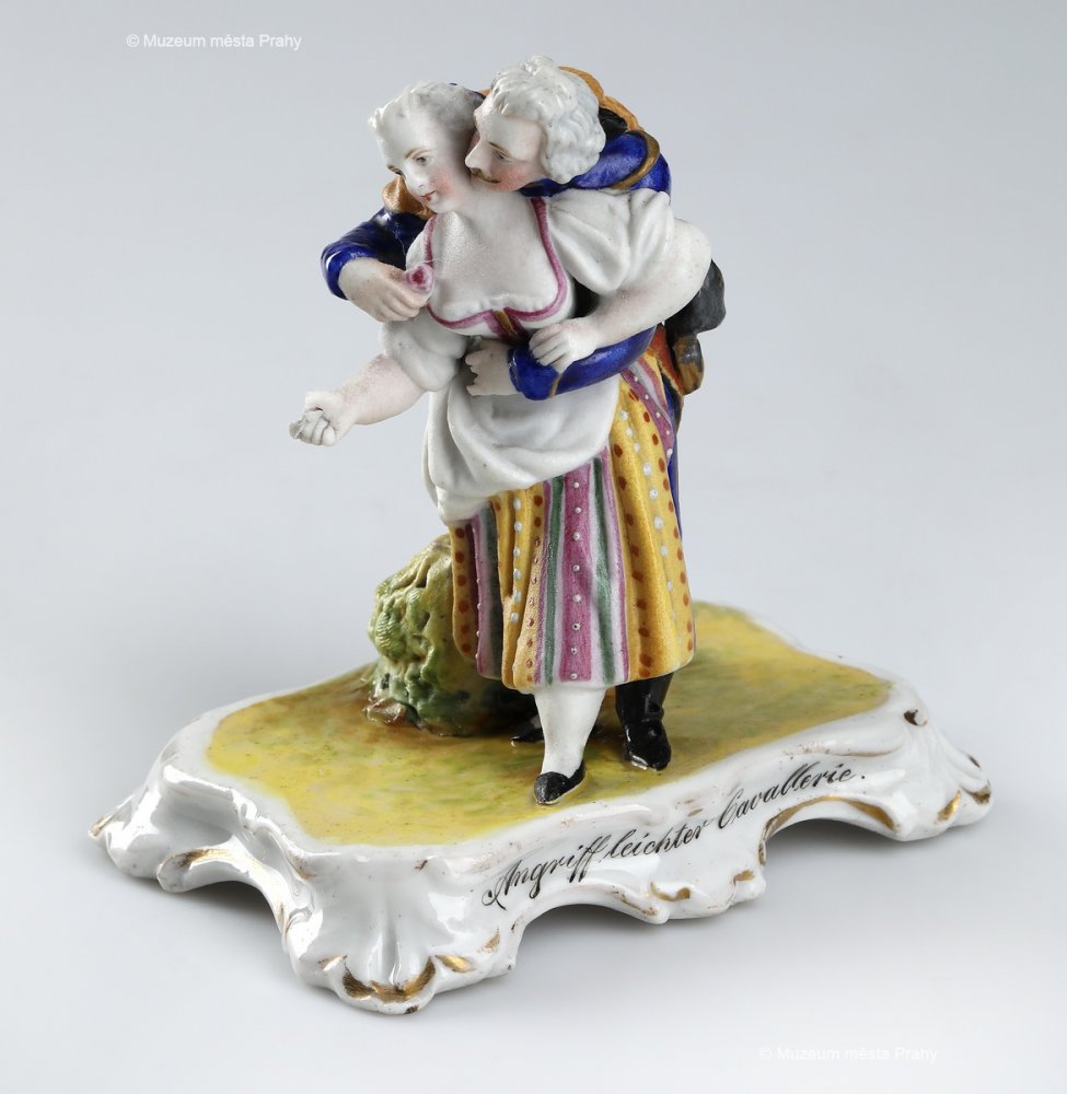 Útok těžké kavalerie, po 1852, glazovaný, malovaný, zlacený porcelán, v. 11,9 cm, vyrobeno ve smíchovské porcelánce, značka výrobce Prag, sbírka MMP, inv. číslo H 137 153
