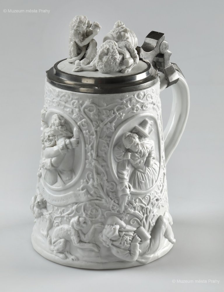 Ernst Popp (připsáno): Holba s víkem, po 1852, biskvit, stříbro, v. 18 cm, vyrobeno ve smíchovské porcelánce, značka výrobce Prag, sbírka MMP, inv. číslo H 086 812