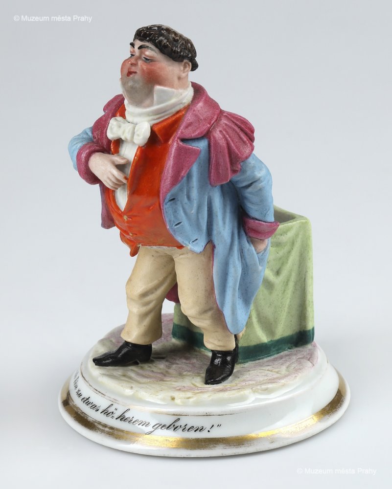 Ernst Popp: Herec Wenzel Scholz jako magistr Wampl, po 1857, malovaný biskvit, částečně glazovaný, zlacený, v. 13 cm, vyrobeno ve smíchovské porcelánce, značka výrobce Prag, sbírka MMP, inv. číslo H 020 324