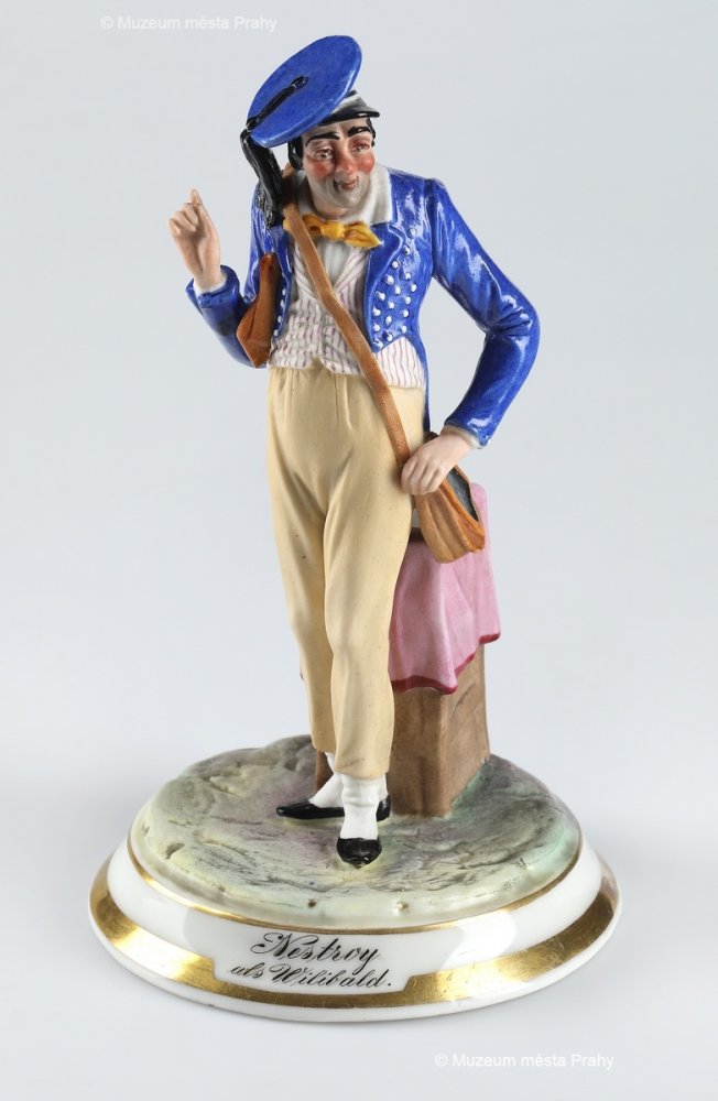 Ernst Popp: Herec Johann Nestroy jako žák Willibald, po 1857, malovaný biskvit, částečně glazovaný, zlacený, v. 15,5 cm, vyrobeno ve smíchovské porcelánce, značka výrobce Prag, sbírka MMP, inv. číslo H 054 658