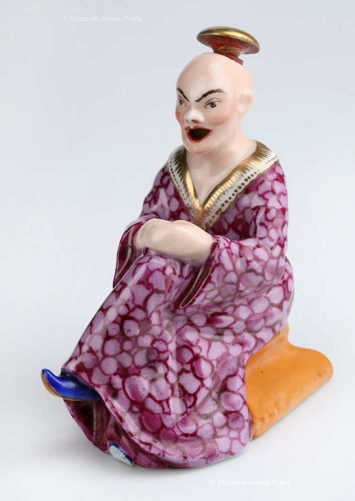 Flakón ve tvaru sedícího Číňana, 1842–1852, glazovaný, malovaný, zlacený porcelán, v. 10 cm, vyrobeno ve smíchovské porcelánce, značka výrobce K&C PRAG, sbírka MMP, inv. číslo H 020 326