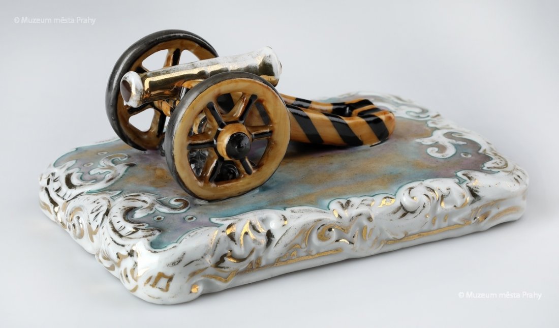 Těžítko ve tvaru děla, po 1852, glazovaný, malovaný, zlacený porcelán, 5,5 × 13 × 8,5 cm, vyrobeno ve smíchovské porcelánce, značka výrobce Prag, sbírka MMP, inv. číslo H 046 408