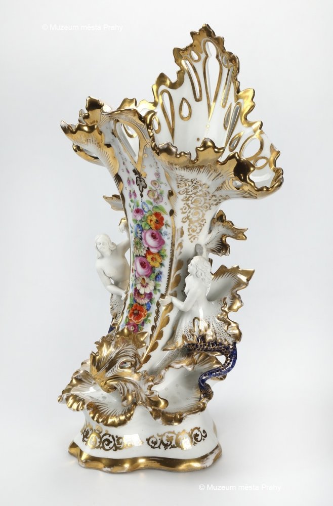Váza, 1847–1848, glazovaný, malovaný, zlacený porcelán, v. 29,7 cm, vyrobeno ve smíchovské porcelánce, značka výrobce K&C PRAG, sbírka MMP, inv. číslo H 033 742